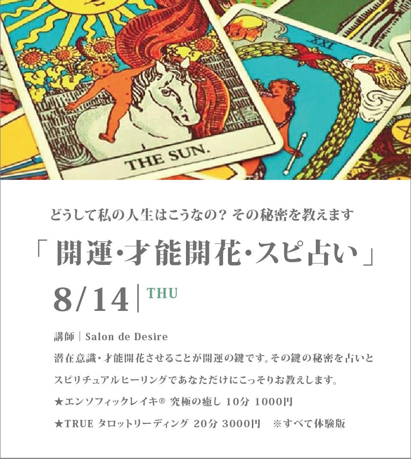 +mahalo:タイル雑貨/ma❁made:フラワーリース/Dita:ドライフラワー/アロマと花の森:アロマ/mesomeso:ヒンメリ/toutohana:籐編み・かご/carebeauty蒼天:ハンドケア/natural healing Neroli:ヒーリング/いつか:ヒーリング/Light Centerネフェル:タロット・ヒーリング/Salon de Desire:スピリチュアルヒーリング