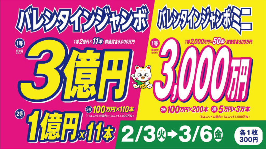 1等・前後賞合わせて3億円の 『バレンタインジャンボ宝くじ』全国で1等 2億円が最大 11本、1等の前後賞 5千万円が最大 22本、