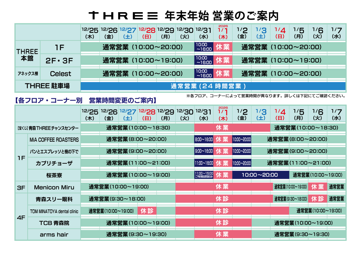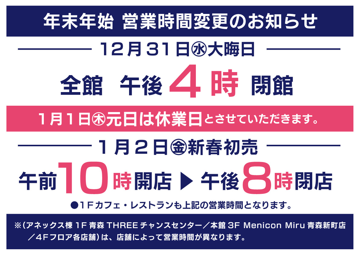 ※(アネックス棟1F 青森THREEチャンスセンター/本館3F Menicon Miru青森新町店/4F各店舗)は、店舗によって営業時間が異なります。詳細は以下をご確認ください。