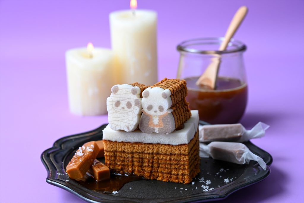 ミイラとドラキュラのかわいいかいぶつパンダバウムは、香ばしく薫るキャラメルにほんのりと塩をきかせた塩キャラメル味のバウムです。