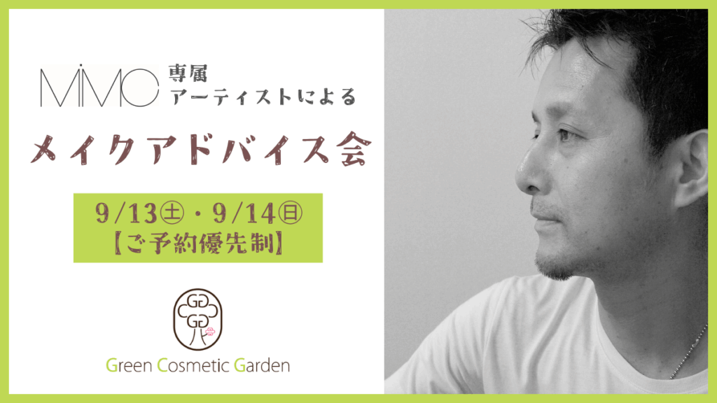 9月13日㊏・14日㊐、本館2F [コスメ] Green Cosmetic Garden (グリーンコスメティックガーデン) では、国産オーガニックコスメブランド”MiMC”の専属アーティスト:中西貴也によるメイクアドバイス会を開催いたします。