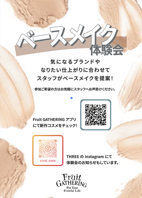 本館2F [コスメ] Fruit GATHERING (フルーツギャザリング)青森店にて、1/29㊍と1/30㊎の2日間、「冬のおすすめ・ベースメイク体験会」を開催いたします!